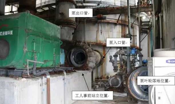 14時38分,當工作人員擰下A泵端蓋兩側(cè)螺栓,開始用頂絲持續(xù)頂泵體端蓋時,A漿液循環(huán)泵泵體突然隨大量漿液水沖出,位于端蓋前檢修人員于某受撞擊倒地,遭其碾壓,右側(cè)大腿嚴重受傷。