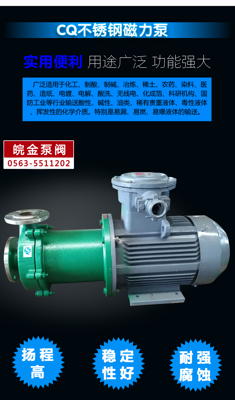不銹鋼磁力泵又稱其為磁力離心泵、不銹鋼磁力驅動泵、耐腐蝕磁力化工泵,JCQ不銹鋼磁力泵是金屬磁力泵中的經典結構款型。