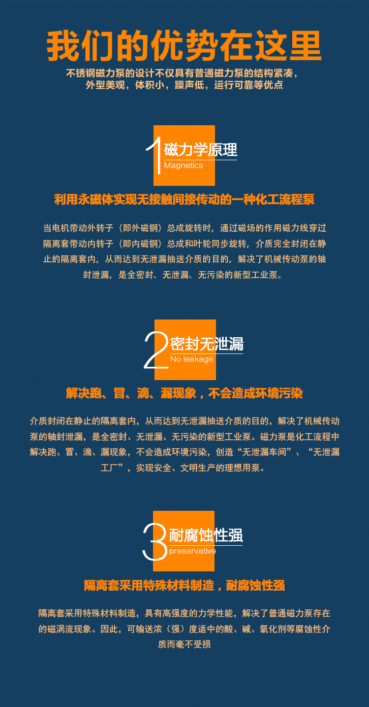 WJC不銹鋼磁力泵過流部件采用全不銹鋼材料(304、316、316L),內(nèi)、外磁轉(zhuǎn)子選用高磁能積、高矯頑力的稀土永磁制造,具有高效節(jié)能、介質(zhì)適用面廣、耐高溫、磁性強、不退磁等優(yōu)點,對有機酸,有機化合物,堿,中性溶液和各種氣體都有良好的耐蝕性,雙螺旋糟碳石墨軸承和硬質(zhì)合金軸套,具有較強的耐磨性,是應用磁力耦合實現(xiàn)無接觸傳動、無動密封的新型高品質(zhì)磁力化工泵。保證了產(chǎn)品的壽命,是無泄漏輸送腐蝕性介質(zhì)的理想用泵。