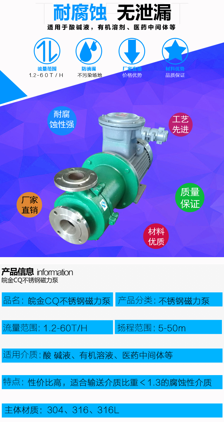 不銹鋼磁力泵又稱其為磁力離心泵、不銹鋼磁力驅(qū)動泵、耐腐蝕磁力化工泵,JCQ不銹鋼磁力泵是金屬磁力泵中的經(jīng)典結(jié)構(gòu)款型。