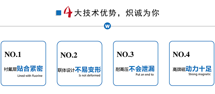 ZMD襯氟自吸磁力泵是我公司新一代耐腐蝕自吸磁力泵,它不但集氟塑料磁力泵的優(yōu)點于一身,而且具有自吸功能、無泄漏,這是以往的所有氟塑料磁力泵不能達到的,因此,該系列泵一推出就受到了廣大用戶的歡迎。該系列泵可廣泛適用于化工、有色金屬冶煉、農(nóng)藥、制酸制堿、造紙、酸洗工藝、稀土分離、電鍍、電子、化成箔、卸酸堿等行業(yè)或工作流程,是目前磁力泵品種中結(jié)構新穎的產(chǎn)品之一,且高效節(jié)能、安全實用。