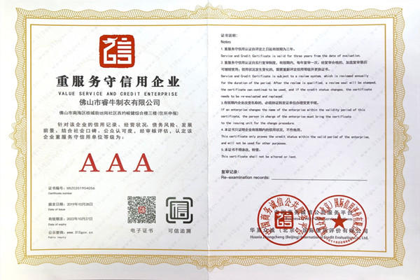 佛山市睿牛制衣有限公司——3A級重服務(wù)守信用企業(yè);