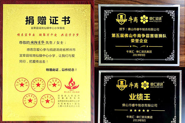 大家看一下下面的獎項就知道睿牛制衣還是個不錯的良心企業(yè)也是一家有實力的沖鋒衣生產(chǎn)廠家,我們的總經(jīng)理同時也是非常有愛心的,她經(jīng)常做善事來匯報社會,因為她 出生在70年代從小的生活也是很艱苦的,他非常能夠理解學(xué)生渴望讀書的那種心情,所以我們老板歐陽月華女士特地愛心參與捐贈宜章縣瑤崗仙鎮(zhèn)中心小學(xué)落成,凝聚萬千愛,共圓心學(xué)子夢!還有我們總經(jīng)理系上絲帶的照片,讓大家共同把愛傳遞出去!