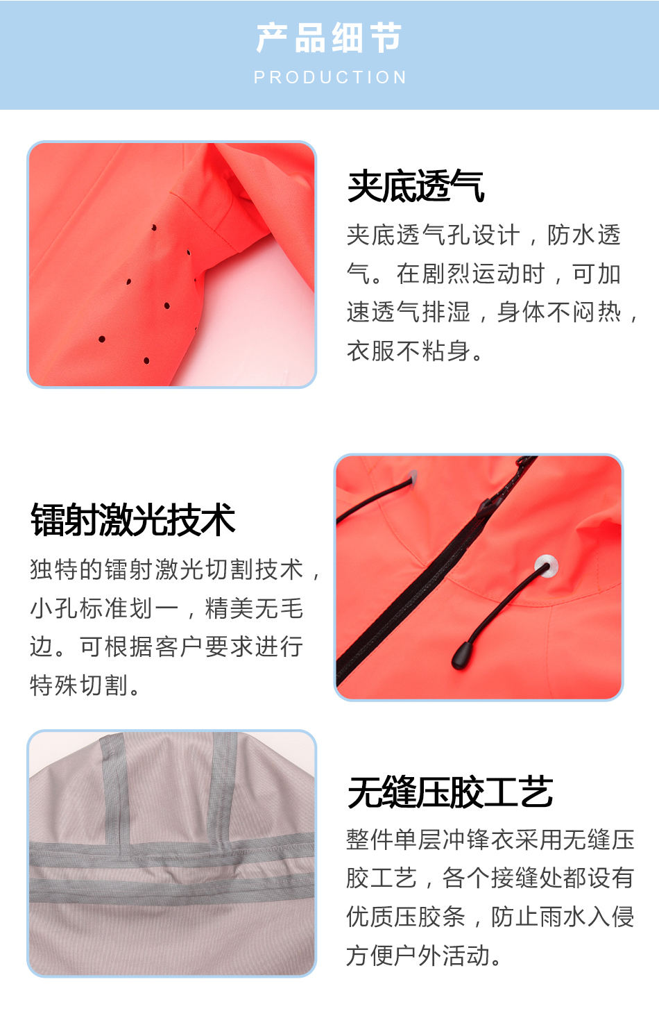 • 無縫壓膠工藝:整件單層壓膠沖鋒衣采用無縫壓膠工藝,各個接縫處都設有優(yōu)質壓膠條,防止雨水入侵方便戶外活動。