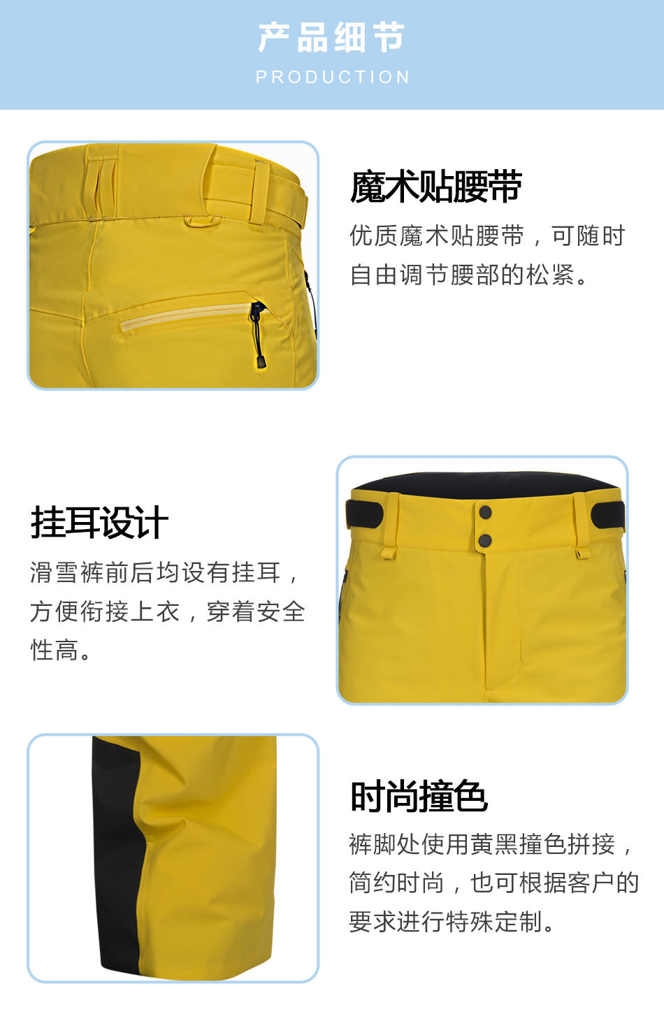 • 掛耳設(shè)計滑雪褲定制前后均設(shè)有掛耳,方便銜接上衣,穿著安全性高。