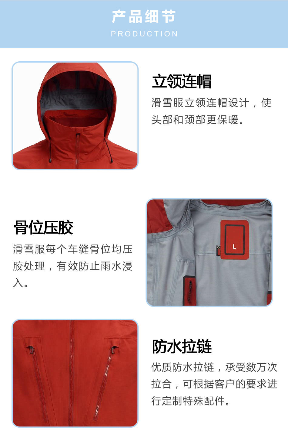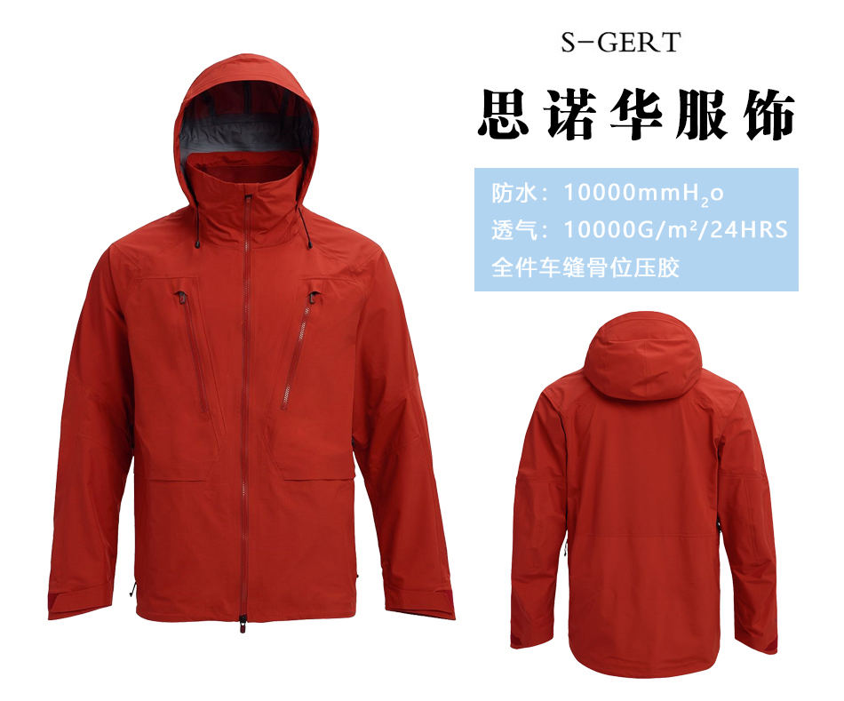 骨位壓膠:壓膠滑雪服生產(chǎn)的每個車縫骨位均壓膠處理,有效防止雨水浸入。